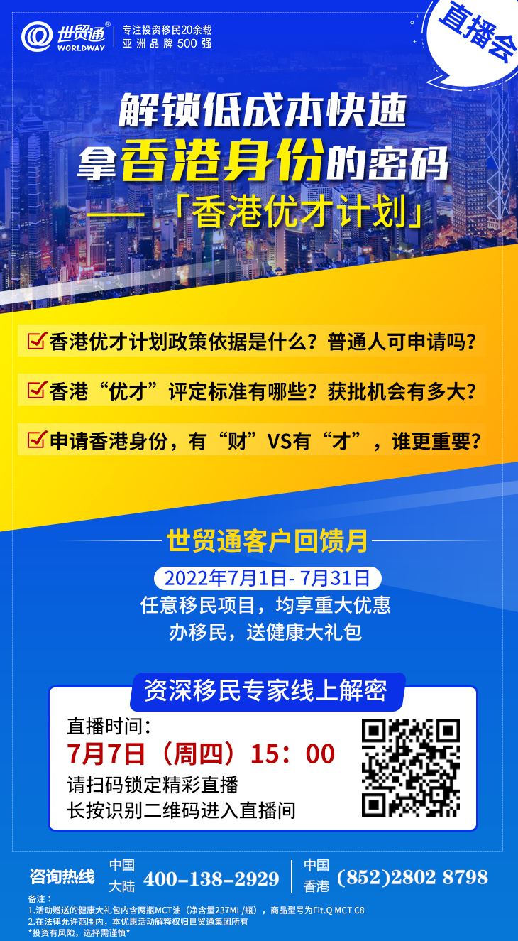 为帮助因身份规划、子女教育等原因而移居香港的人士,解决香港身份申请问题,世贸通特邀香港资深移民专家线上解密低成本快速拿香港身份——「香港优秀人才入境计划」,请锁定“世贸通直播间”,别错过!