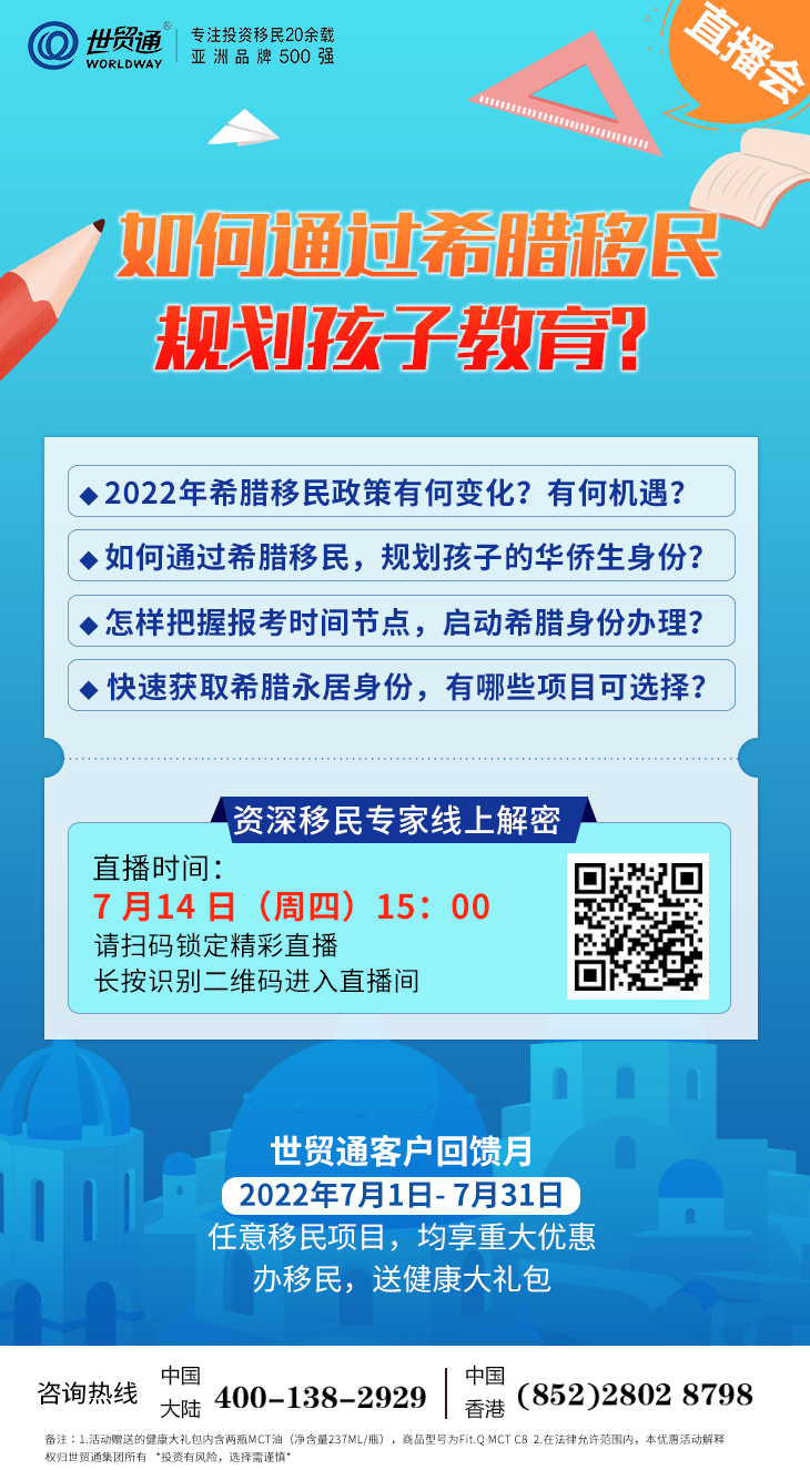 2022年希腊移民政策有何变化?有何机遇?如何通过希腊移民,规划孩子的华侨生身份?怎样把握报考时间节点,启动希腊身份办理?快速获取希腊永居身份,有哪些项目可选择?请锁定“世贸通直播间”,别错过!