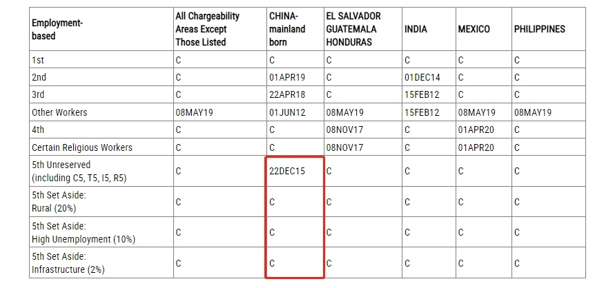 A表:Final Action Dates For Employment-Based Preference Cases