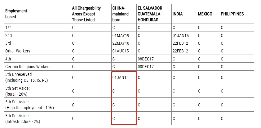 值得注意的是,EB-5签证预留类别(乡村地区项目预留签证20%、高失业率地区项目预留签证10%、基建项目预留签证2%),目前是继续无排期状态。