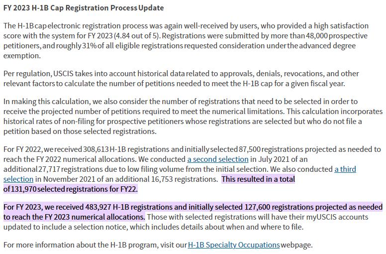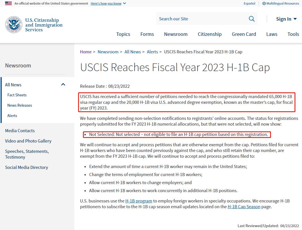 当地时间8月23日,美国移民局(USCIS)在官网上正式宣布,今年H1B抽签已达85,000份上限,移民局将不再发放额外名额。同时美国移民局还宣布,他们已经完成了对未中签的通知工作,现在在美国移民局系统中,完成注册但未中签的申请状态全部显示“Not Selected未中签”。