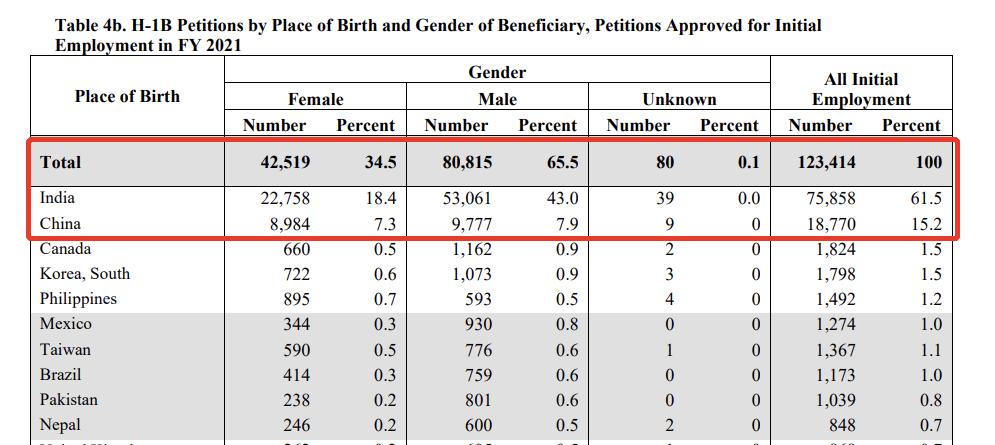 此外,根据美国移民局公布的数据,在2021财年,移民局共批准了123,414 份H-1B首签申请(包括受配额限制需抽签的申请和不受配额限制的申请)。可叹的是,在这123,414个获批的幸运儿中,有75,858 位是印度申请人,占61.5%。而中国申请人仅有18,770人,占15.2%。