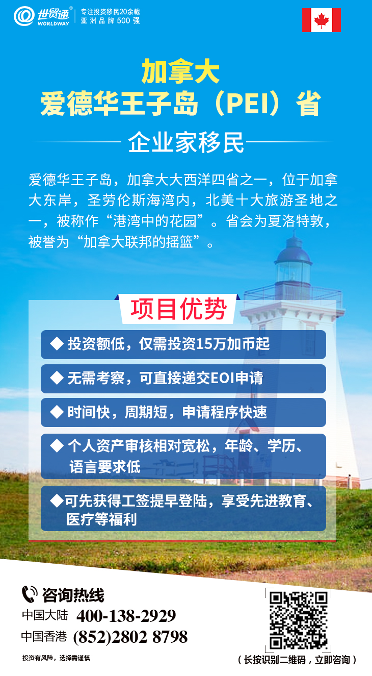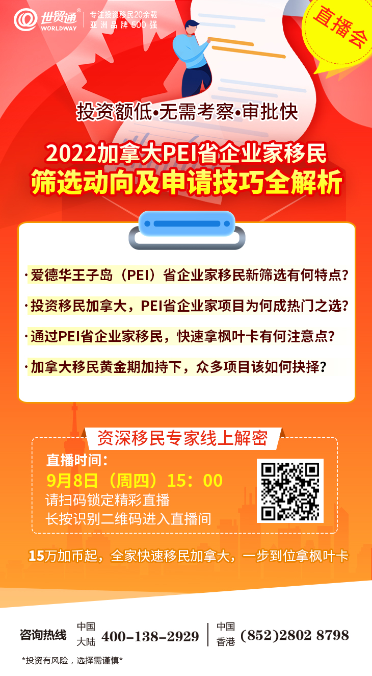 对于已经作出加拿大移民决定的人士而言,加拿大移民黄金期加持下,众多项目该如何抉择?爱德华王子岛省企业家移民新筛选有何特点?投资移民加拿大,PEI省企业家项目为何成热门之选?通过PEI省企业家移民,快速拿枫叶卡有何注意点?世贸通特邀加拿大资深移民专家线上解密,并为您分享低门槛快速移民加拿大的高效方法,请锁定“世贸通直播间”,精彩别错过!