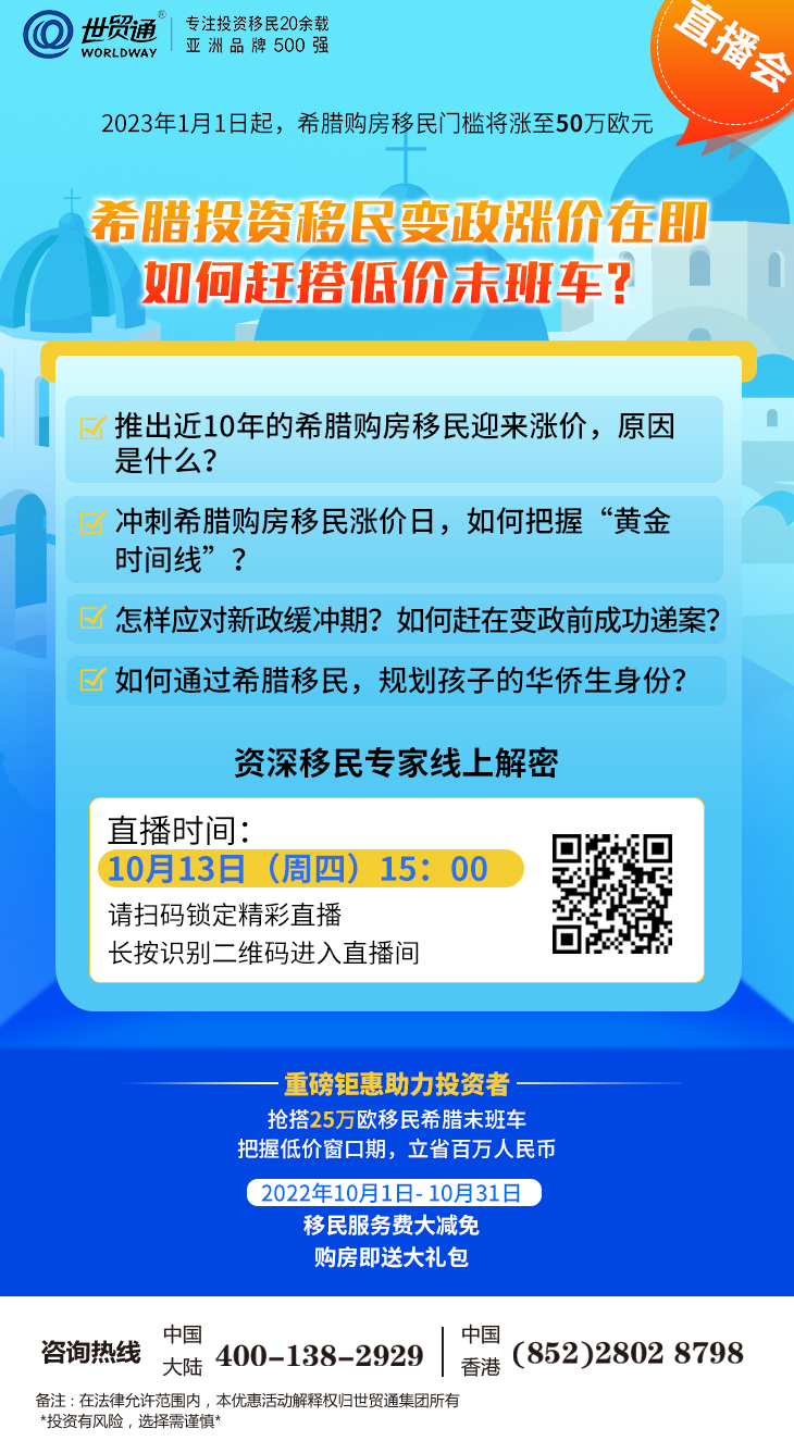 推出近10年的希腊购房移民迎来涨价,原因是什么?冲刺希腊购房移民涨价日,如何把握“黄金时间线”?怎样应对新政缓冲期?如何赶在变政前成功递案?如何通过希腊移民,规划孩子的华侨生身份?请锁定“世贸通直播间”,别错过!