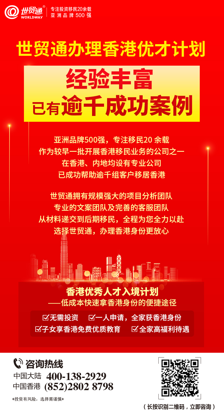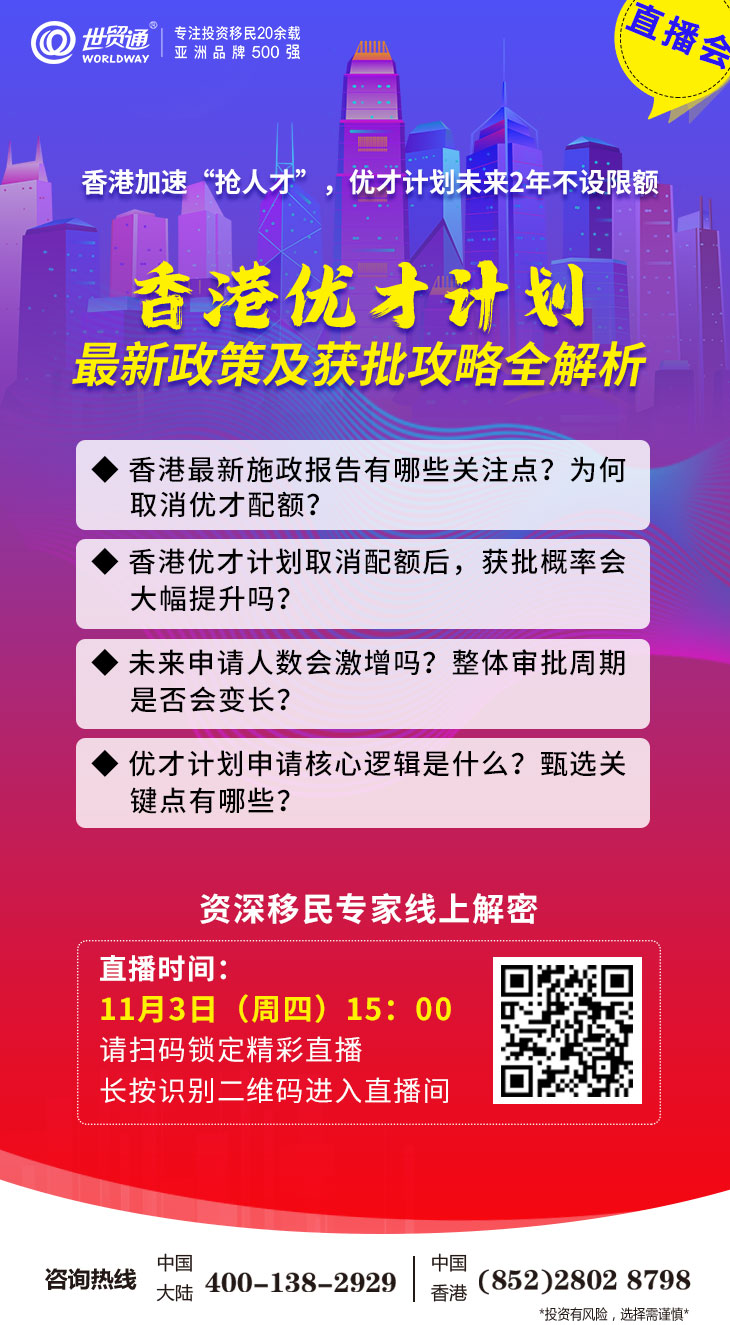为帮助因身份规划、子女教育等原因而移居香港的人士,解决香港身份申请问题,世贸通特邀香港资深移民专家线上分享香港优才计划最新政策及获批攻略,请锁定“世贸通直播间”,精彩别错过!