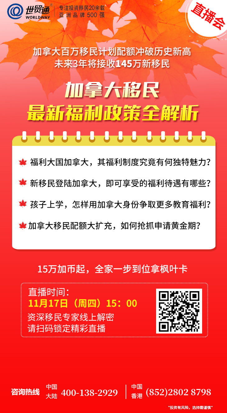 对于已经作出加拿大移民决定的人士而言,加拿大百万移民计划配额大扩充,如何抢抓申请黄金期?移民加拿大后,即可享受的福利待遇究竟有哪些?世贸通特邀加拿大移民专家线上解密!满满的实用信息,请锁定“世贸通直播间”,精彩别错过!