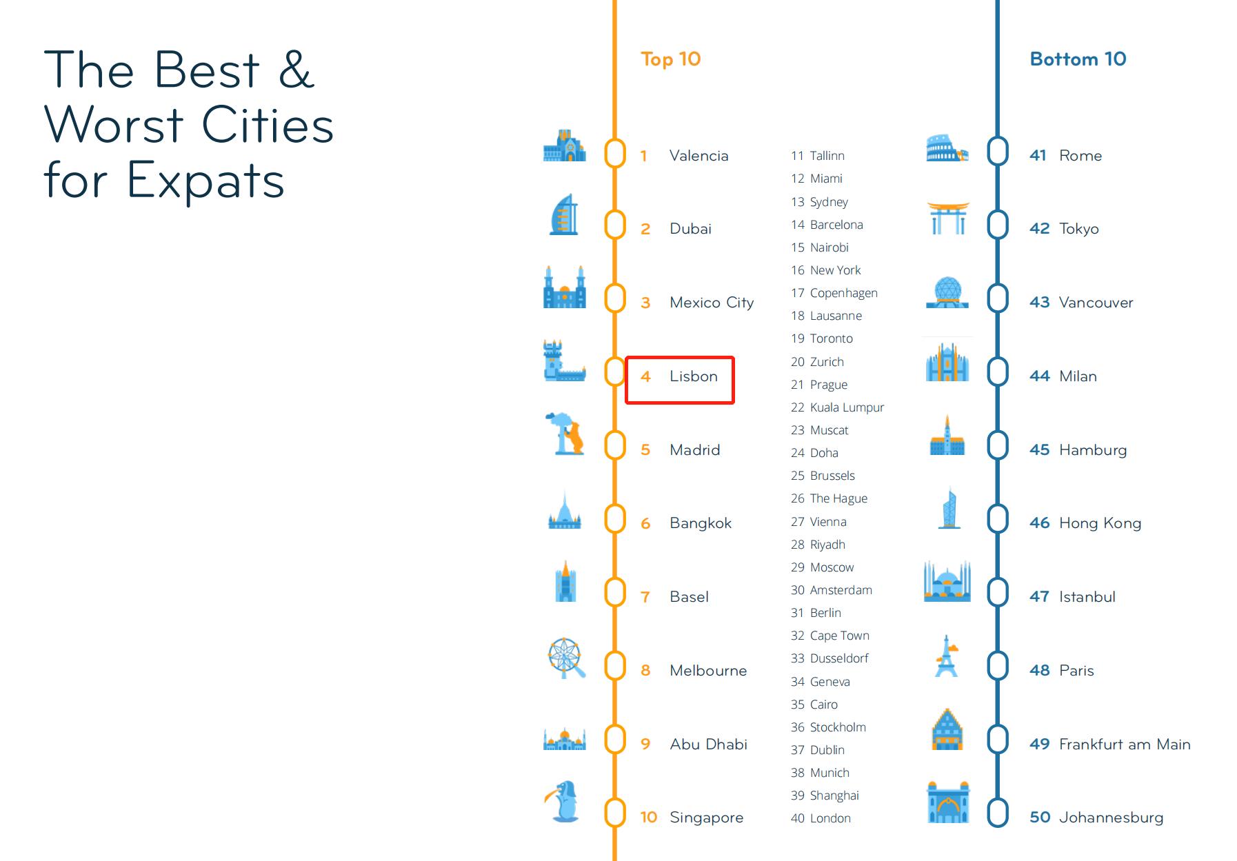 近日,全球知名外籍人士社区InterNations发布了《2022最适合外籍人士城市排名》(Expat City Ranking 2022)报告,最适合外籍人士城市中,前三名分别是瓦伦西亚、迪拜、墨西哥城,葡萄牙首都里斯本紧随其后,位列第四名。