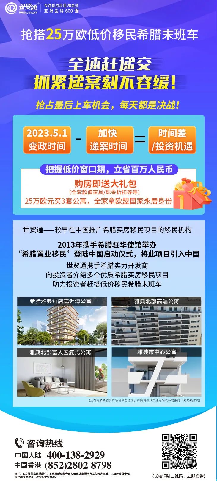 与此同时,作为目前移民市场上少有的可以快速拿欧盟绿卡的项目,希腊购房移民凭借25万欧元起的较低投资额,成为欧洲国家所有移民项目中性价比非常友好的项目,同样备受全球投资者热捧!2023年5月1日起,希腊购房移民投资额将涨至50万欧元,赶搭25万欧元低价移民希腊末班车,还在犹豫观望的申请人,要抓紧时间了!
