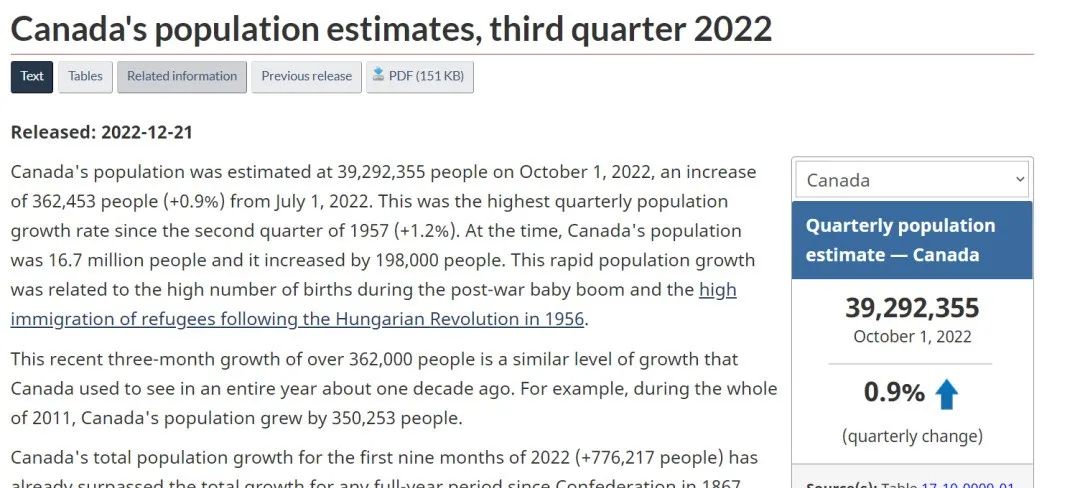 近日,加拿大统计局公布了最新的全国人口增长数据。数据显示,截至2022年10月1 日,加拿大人口估计为 39,292,355 人,比2022年7月1日增加了362,453人(+0.9%),甚至多于2011年全年35万人口的总增长,这也是自1957年第二季度(+1.2%)以来的最高季度人口增长率。