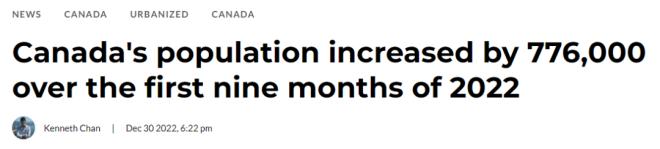加拿大 2022年前九个月的总人口增长(+776,217 人)已经超过自1867年联邦以来任何全年的总增长。在完全计算10月至12月的数据之后,加拿大2022年可能会看到惊人的约100万总人口增长。