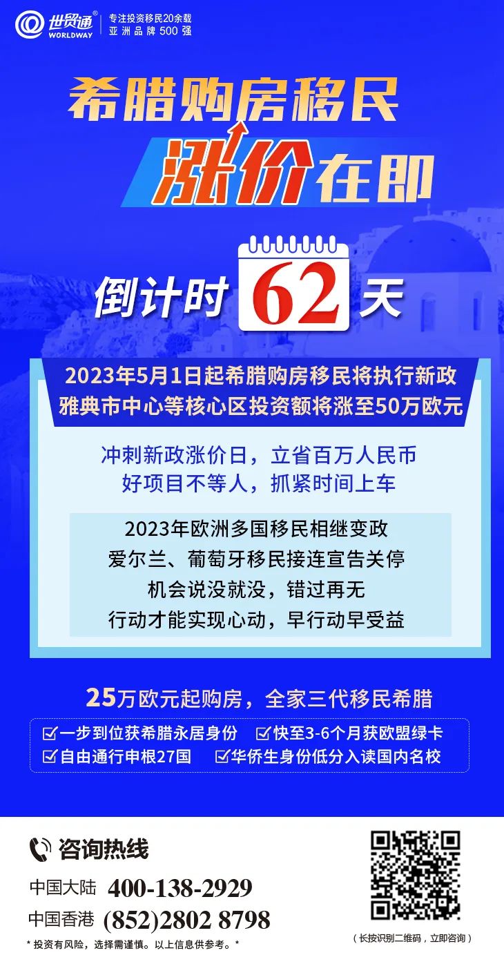 想要搭上涨价前末班车,请务必尽快行动!近日以来,欧洲各国移民政策相继变政,爱尔兰投资移民计划关停、葡萄牙总理宣布将终结黄金居留政策、西班牙政党也提出关闭置业投资移民项目。移民欧洲的选择越来越少了。赶搭25万欧元低价移民希腊末班车,就是现在。