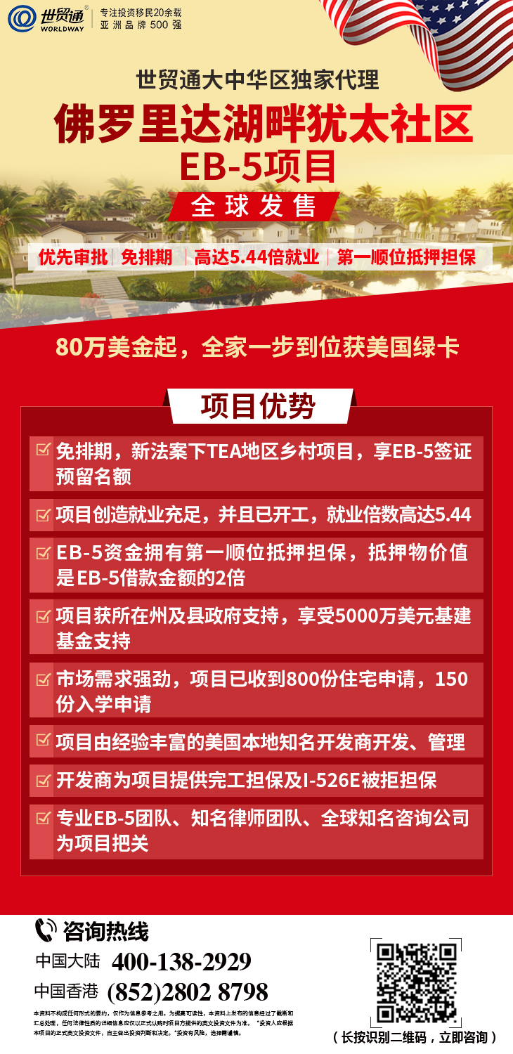 其中,由世贸通集团担任大中华区独家代理的「佛罗里达湖畔犹太社区」EB-5项目,目前正在火热认购中!项目是符合新法案下TEA地区乡村项目,享受EB-5签证预留名额,集优先审批、免排期、就业倍数高达5.44、EB-5资金拥有第一顺位抵押担保、投资仅需80万美元起等优势于一身,助力投资人快速移民美国,全家一步到位拿绿卡!全球仅限125席,认购从速!