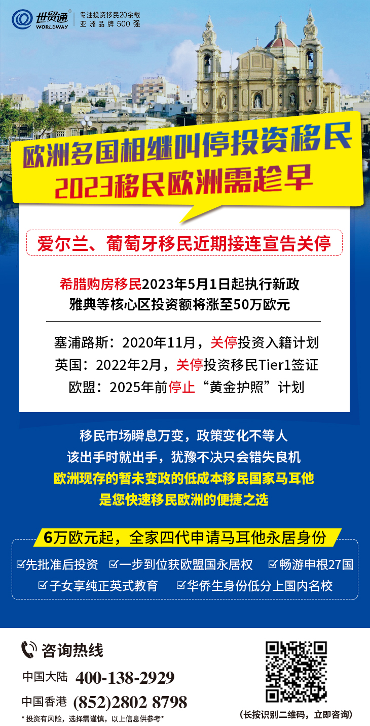 同时,2023年以来,欧洲多国移民相继变政,爱尔兰、葡萄牙移民接连宣告关停!市场瞬息万变,政策变化不等人,机会说没就没,移民欧洲真的要趁早!目前,欧洲现存的暂未变政的低成本移民国家马耳他,是您快速移民的欧洲理想之选!6万欧元起,全家四代移民马耳他,一步到位获欧盟国家永居权!