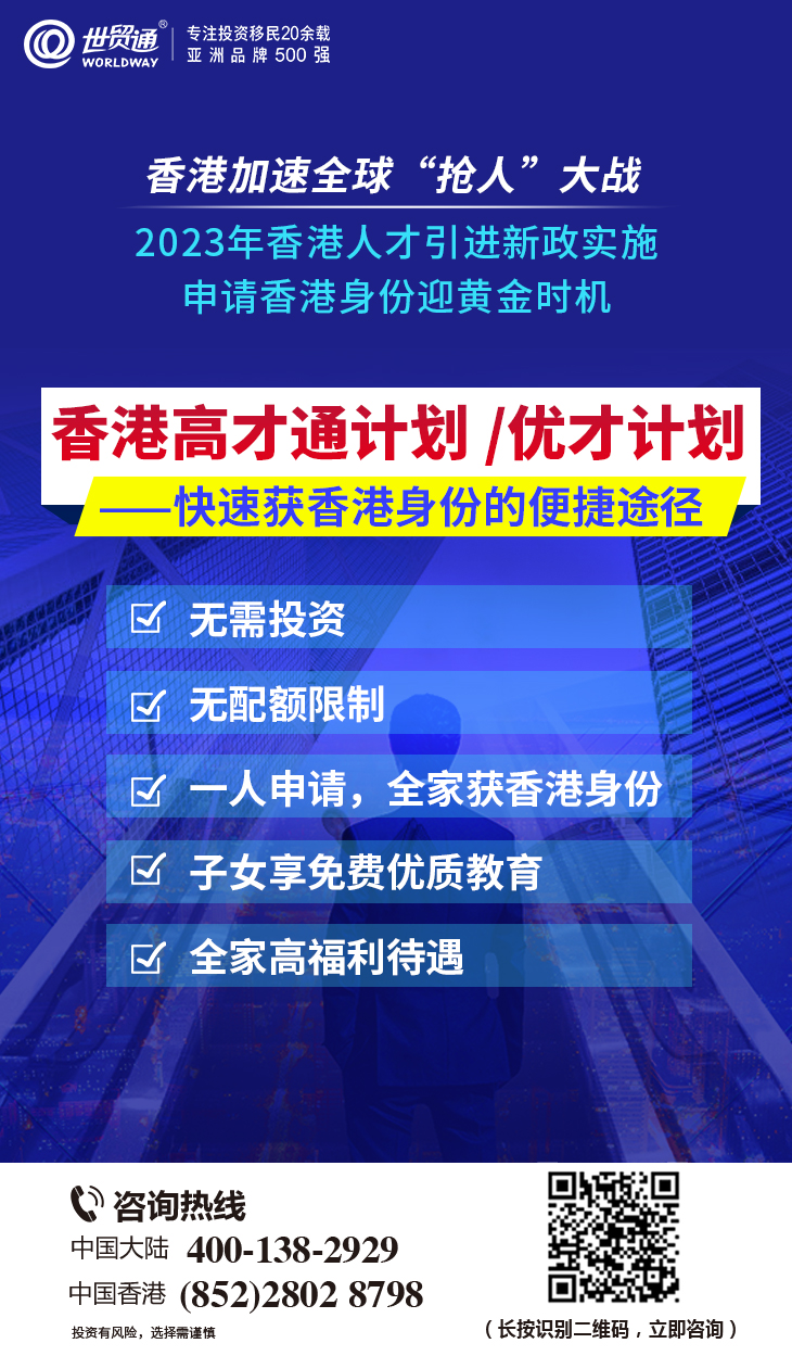 此外,香港加速全球“抢人”大战,2023年香港人才引进新政实施,办理香港身份的黄金时机来了!香港高端人才通行证计划和香港优秀人才入境计划,正备受内地投资者热捧!优才计划未来2年不设限额,只要申请者符合要求,无须投资,无须事先获得本地雇主聘请,到港后可以自由选择工作、定居;高才通计划无评分要求、无配额限制,高薪人士或全球百强院校毕业人士即可申请,一人获批全家受益。