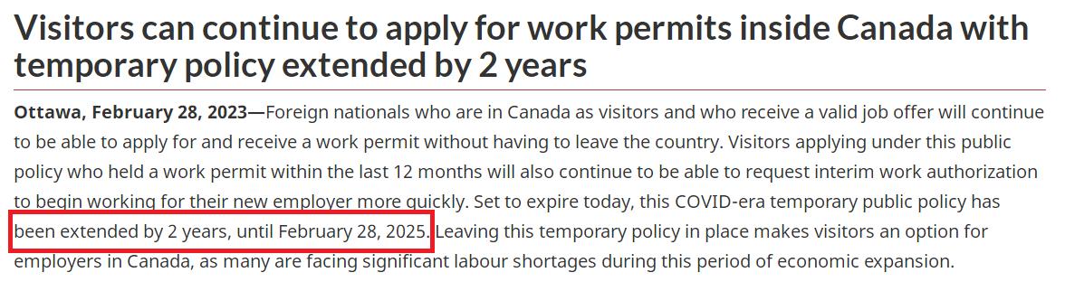 重大利好!加拿大境内旅游签转工签临时政策又延期2年,至2025年2月28 日!