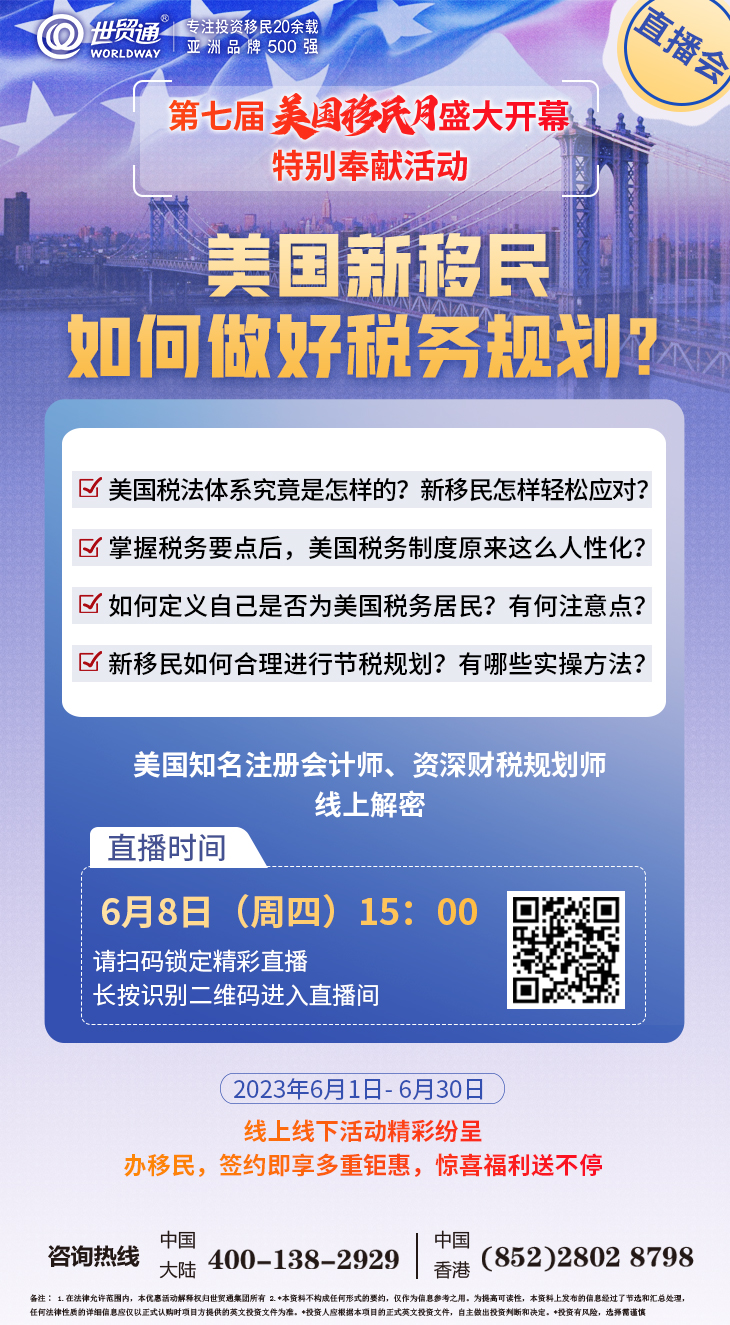为了帮助广大移民投资者,更全面的了解美国税法,解决好移民美国前后的税务规划问题,第七届美国移民月期间,世贸通特别奉献活动美国税务直播讲座精彩上演,世贸通特邀美国知名注册会计师、资深财税规划师在线为您解密美国税务真相,深度解析新移民登陆美国前后的财税规划,并分享合理节税的实操方法。请锁定“世贸通直播间”,精彩别错过!