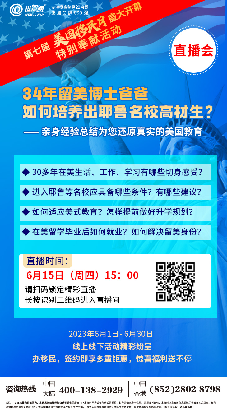 这也是“第七届美国移民月”第二场特别奉献活动,世贸通特邀34年留美博士爸爸在线分享他是如何培养出耶鲁名校高材生?以亲身经验总结为您还原真实的美国教育!同时,在美国生活、工作、学习又有哪些切身感受?请锁定“世贸通直播间”,精彩别错过!