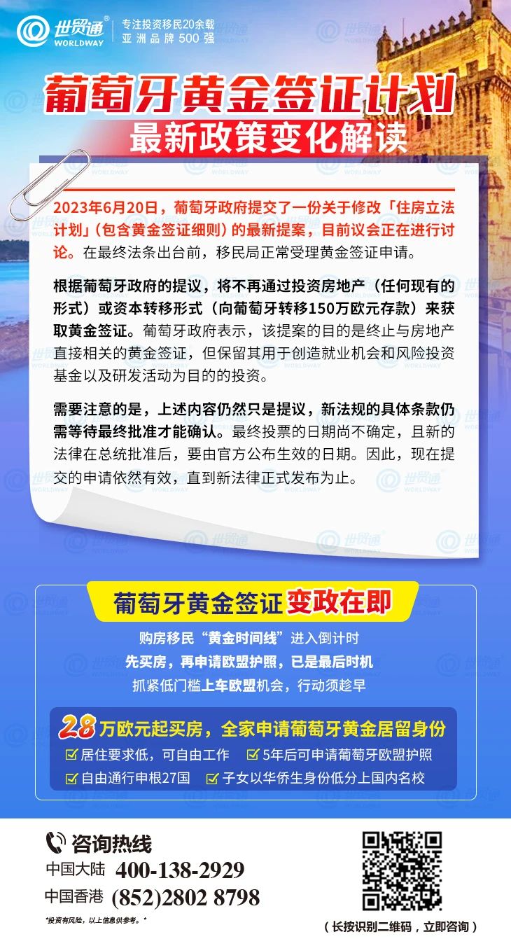 根据葡萄牙政府的提议,将不再通过投资房地产(任何现有的形式)或资本转移形式(向葡萄牙转移150万欧元存款)来获取黄金签证。葡萄牙政府表示,该提案的目的是终止与房地产直接相关的黄金签证,但保留其用于创造就业机会和风险投资基金以及研发活动为目的的投资。