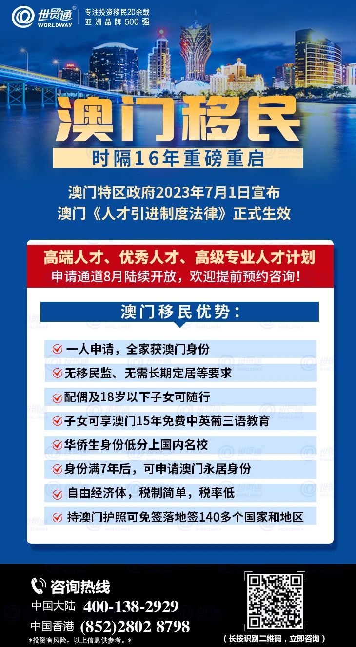 自澳门移民大门重开消息公布以来,就受到了众多移民投资者广泛关注,世贸通不少新老客户纷纷来电咨询相关信息。那么,澳门人才引进计划到底是怎样的?下面,世贸通为您详细介绍!