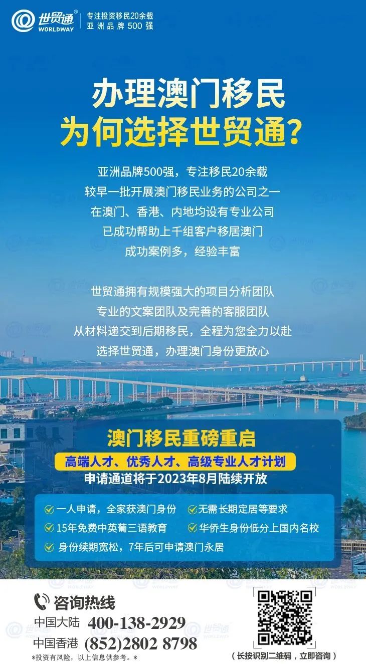 办理澳门身份,更多详情,请在评论区私信我们,或拨打世贸通服务热线,中国大陆:400-138-2929 ,中国香港:(852)2802 8798