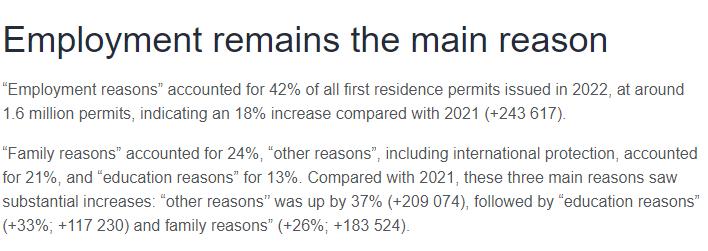 数据显示,在近370万份居留许可中,42%为工作类居留许可(总计约160万份),24%为家庭团聚类居留许可,21%为其他类居留许可,13%为教育类居留许可。