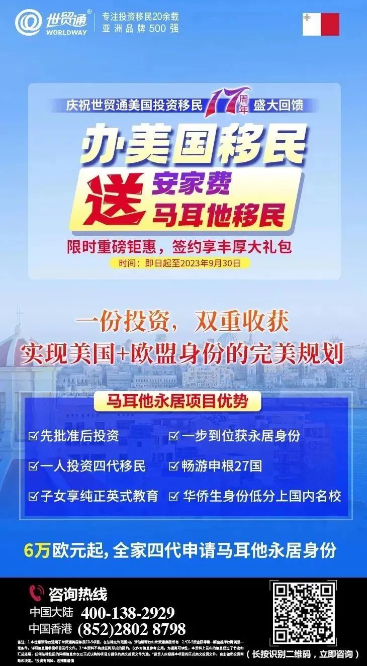 庆祝世贸通美国投资移民十七周年,盛大回馈活动火热进行中!办美国移民,送安家费,另送马耳他移民,实现完美的身份规划!机会难得,不容错过!更多详情,请在评论区私信我们,或拨打世贸通服务热线,中国大陆:400-138-2929 ,中国香港:(852)2802 8798