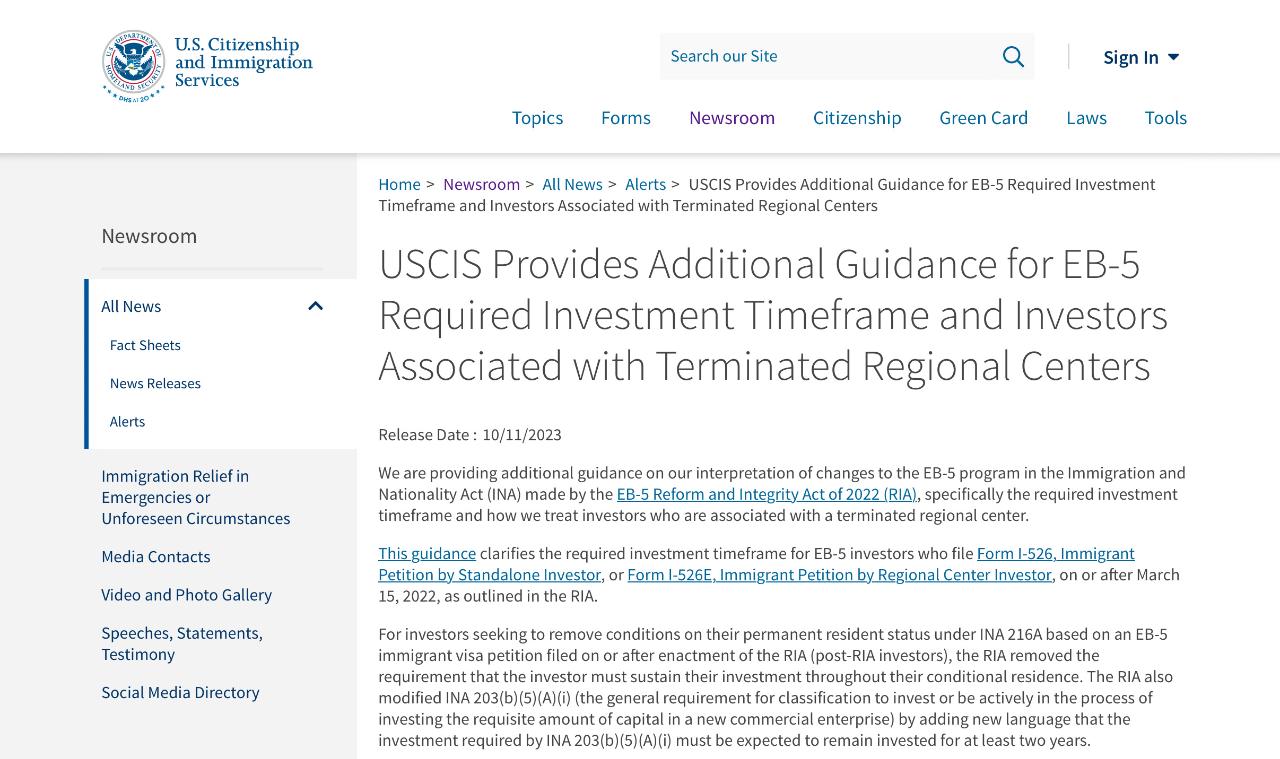2023年10月11日,美国移民局发布了有关新法下EB-5最低投资期的新政策,将新法EB-5投资期缩短至2年。这对于新法下的EB-5投资人而言,是一个巨大的好消息,与旧法对比而言,移民局新规大幅度地缩短了投资期限,并免除了未来再投资的需要。