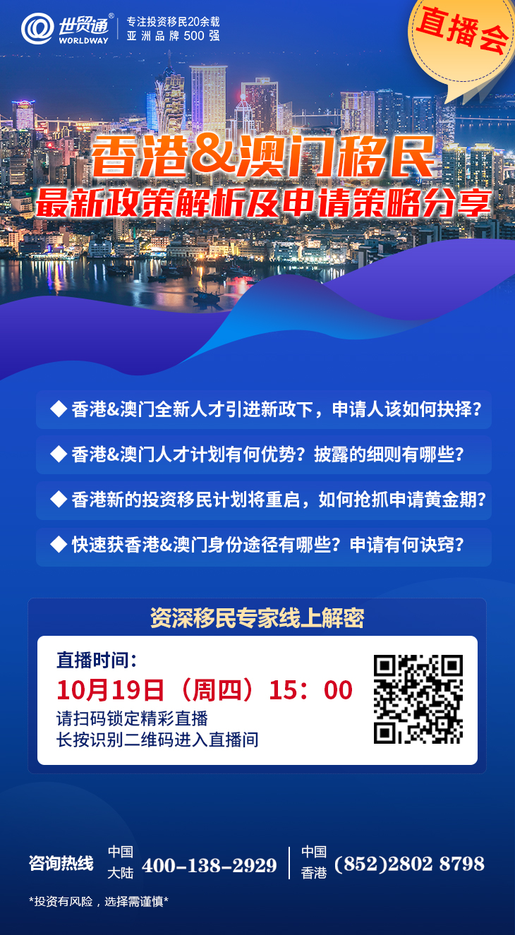 为帮助因身份规划、子女教育等原因而移居香港&澳门的人士,解决香港&澳门身份申请问题,世贸通特邀香港&澳门资深移民专家线上分享香港&澳门移民最新政策及申请技巧,请锁定“世贸通直播间”,精彩别错过!