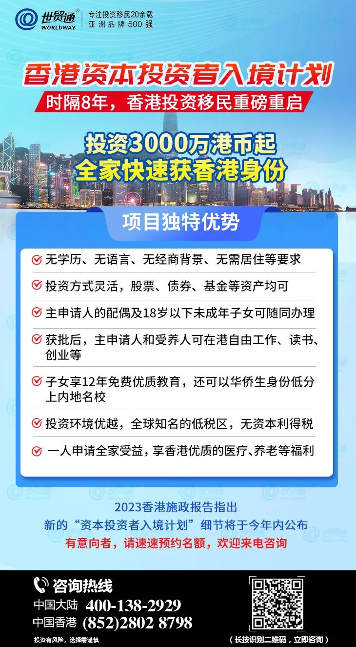 2023香港施政报告指出,新的“资本投资者入境计划”确定年内重启,细节将于今年内公布!这是香港投资移民时隔8年重磅重启,投资3000万港币起,全家可快速获香港身份!有意向者,请速速预约名额,从速来电咨询!