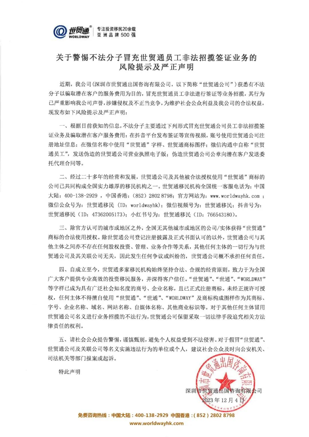 关于警惕不法分子冒充世贸通员工非法招揽签证业务的风险提示及严正声明