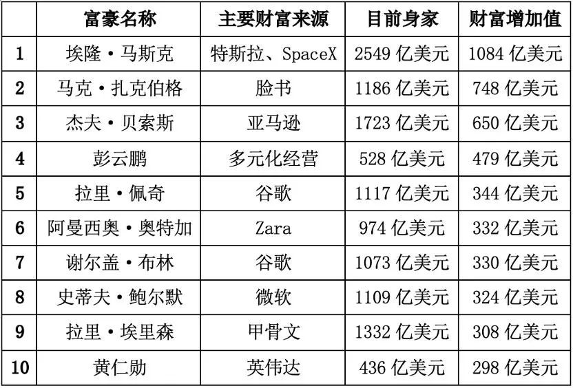 近日,《福布斯》公布了2023年前10位财富增长最多的亿万富豪榜单。榜单显示,截至2023年12月15日,今年财富增长最多的十位富豪的身家总计增加了4900亿美元,这10人中有7人是科技富豪,另外,这10人中有8人来自美国,只有2位来自美国以外。
