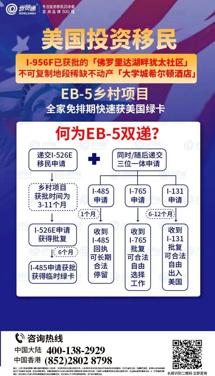 移民有两大关键要素——时机和选择,EB-5“双递交”无排期窗口期稍纵即逝,抓紧时机赶上末班车!对于有移民美国的刚性需求的投资者而言,EB-5预留签证通道中的乡村项目,就是当下快速获取美国绿卡的优选途径中的优选。