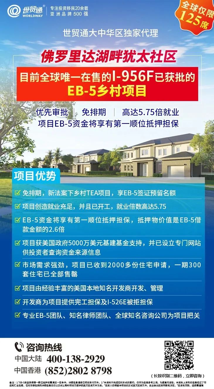 由世贸通担任大中华区独家代理的,I-956F已获批的「佛罗里达湖畔犹太社区」EB-5乡村项目,是投资者快速移民美国的不错之选。项目集合I-956F已获批、免排期、优先审理、项目就业倍数高达5.75、EB-5资金将享有第一顺位抵押担保,抵押物价值是EB-5借款金额的2.6倍、最短投资期仅3年等诸多优势于一身,为投资者提供了快速获得美国绿卡的上佳机会!可遇不可求的优质乡村EB-5项目,经过一轮又一轮的抢购之后,全球仅剩少量名额,好项目不等人,有意向者认购须从速!