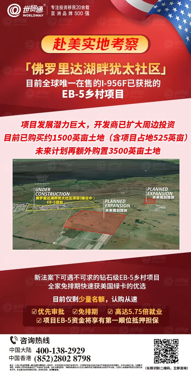 由世贸通担任大中华区独家代理的,I-956F已获批的「佛罗里达湖畔犹太社区」EB-5乡村项目,是投资者快速移民美国的热门之选。该项目集合免排期、优先审理、项目就业倍数高达5.75、EB-5资金将享有第一顺位抵押担保,抵押物价值是EB-5借款金额的2.6倍、最短投资期仅3年等诸多优势于一身,为投资者提供了快速获得美国绿卡的上佳机会!可遇不可求的优质乡村EB-5项目,经过一轮又一轮的抢购之后,全球仅剩少量名额,好项目不等人,有意向者认购须从速!