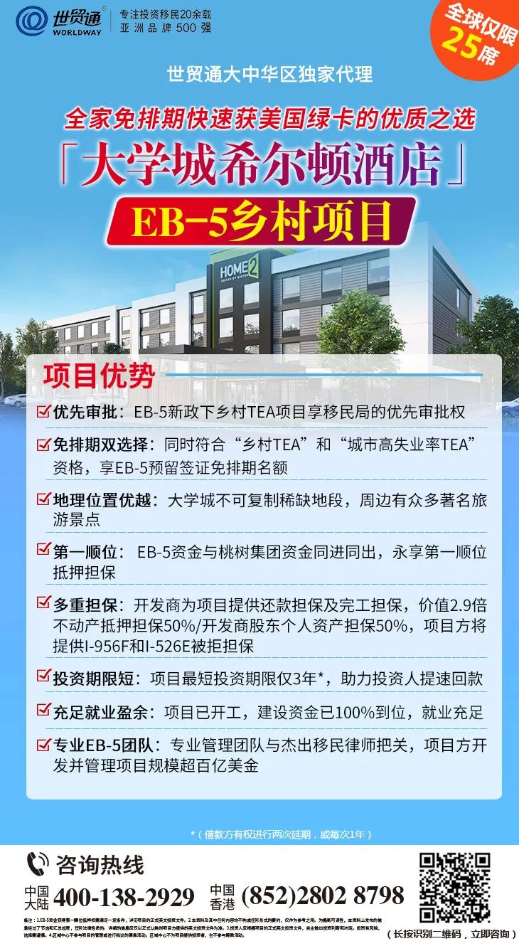 备注:1.在法律允许范围内,本优惠活动解释权归世贸通集团所。2.EB-5资金获得第一顺位抵押权需满足一定条件,详见项目的正式英文投资文件。3.本资料及其中任何内容均不构成任何形式的要约,仅作为参考之用。为提高可读性,本资料上发布的信息经过了节选和汇总处理,任何法律性质的、详细的信息应仅以正式认购时项目方提供的英文投资文件为准。4.投资人应根据项目的正式英文投资文件,自主做出投资判断和决定。投资有风险,选择需谨慎。5.「大学城希尔顿酒店」的区域中心不参与项目的管理或进行拟议的募集活动。该区域中心不为项目提供投资者,也不参与筹款活动。