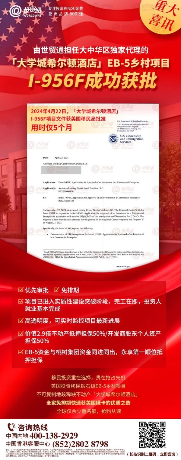 特大喜讯!近日,世贸通大批移民客户投资的「大学城希尔顿酒店」EB-5乡村项目,已成功获美国移民局I-956F批准了!项目于2023年11月22日提交I-956F申请,2024年4月22日获批,用时仅5个月!这意味着:大学城项目已获移民局预先批准,进入快速审批通道。后续只要申请人的个人及家庭申请文件符合相关规定,I-526E申请预计会在3-11月内获批!