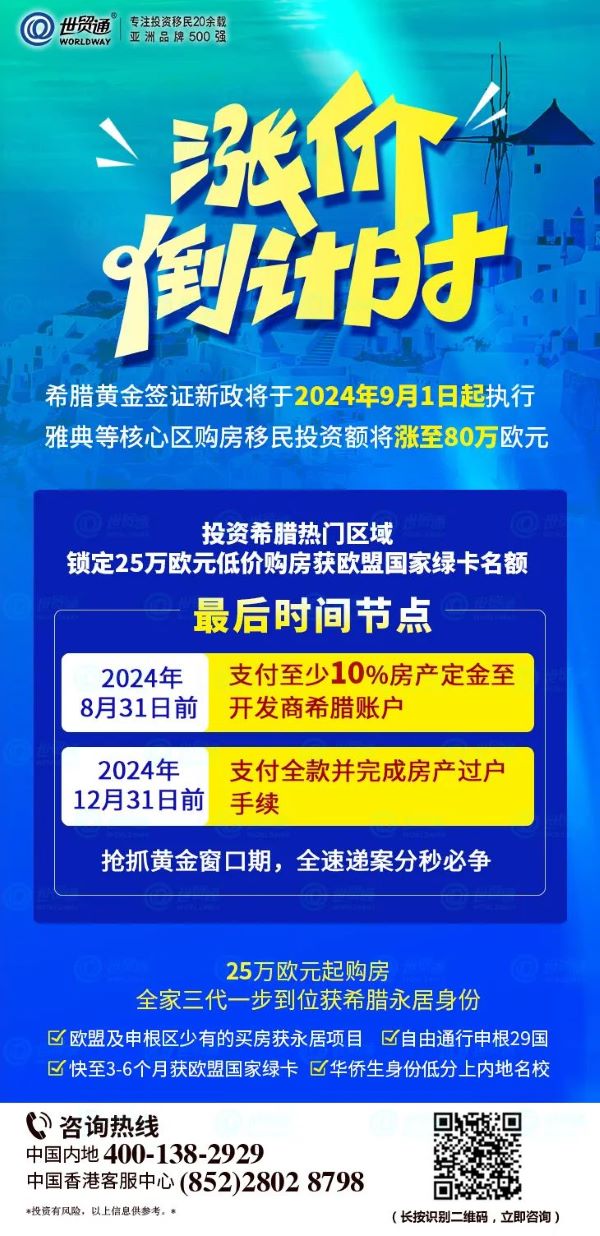 目前,市场上符合希腊黄金居留项目申请法案、能快速过户的优质房源已经不多了,还在观望的投资人更要加快行动步伐,想要抓住当下希腊移民非涨价区的最后投资机会,现在就是最好的行动时刻。世贸通携手希腊实力开发商隆重为投资者介绍多个优质的移民房产项目,助力投资者赶搭25万欧元低价移民希腊末班车。优质房源紧俏,认购从速。
