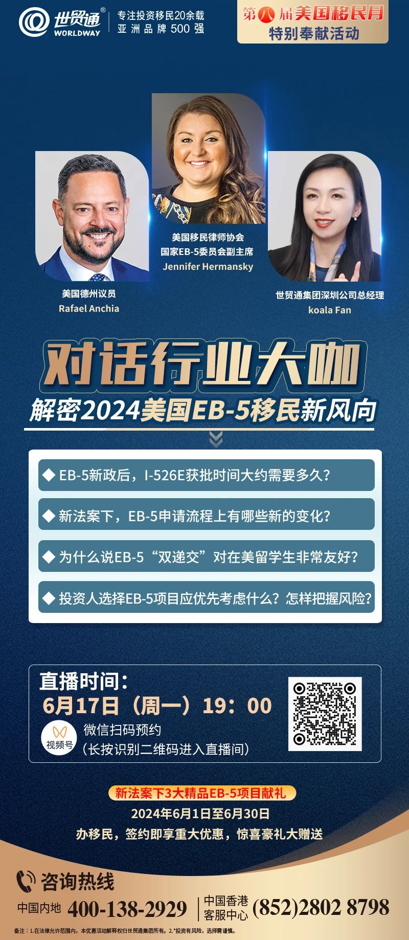美国移民律师协会国家EB-5 委员会副主席、美国德州议员应世贸通邀请,于首发会后将再次做客世贸通直播间,与广大投资人分享2024年美国EB-5移民政策现状及趋势解读。通过这场直播,您将了解到最前沿的EB-5移民政策,第一时间掌握2024年美国移民新风向。这场的直播盛会不容错过,请提前预约!