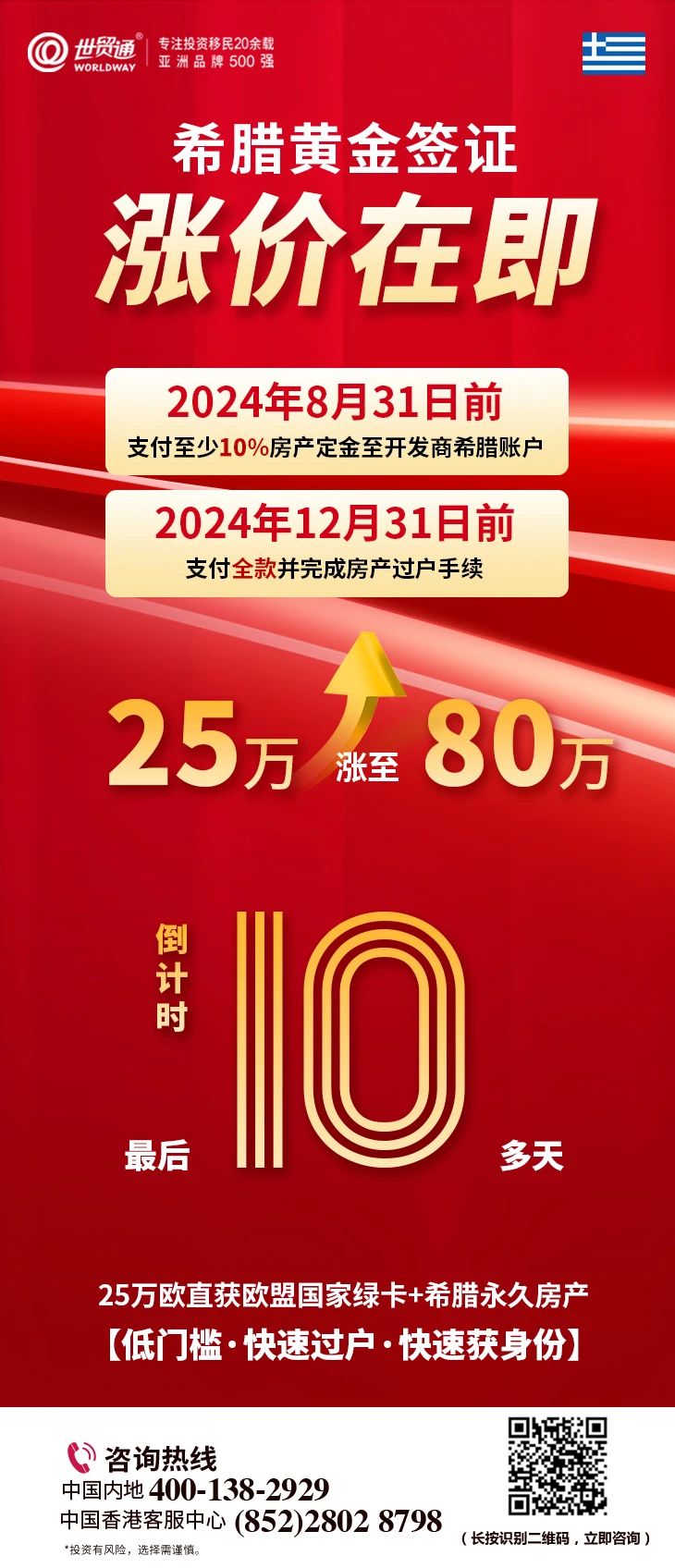 悄然间,八月已步入中旬,希腊购房移民政策的新篇章即将翻开。9月1日起,希腊移民门槛将显著提升,购房投资要求将从25万欧元跃升至80万欧元。这意味着,未来加入希腊移民行列的投资者,需额外筹备约400万人民币的资金,才能迈过这道新设的门槛。对于想要以最低成本获得欧盟身份的申请人来说,现在是采取行动的最佳时机。