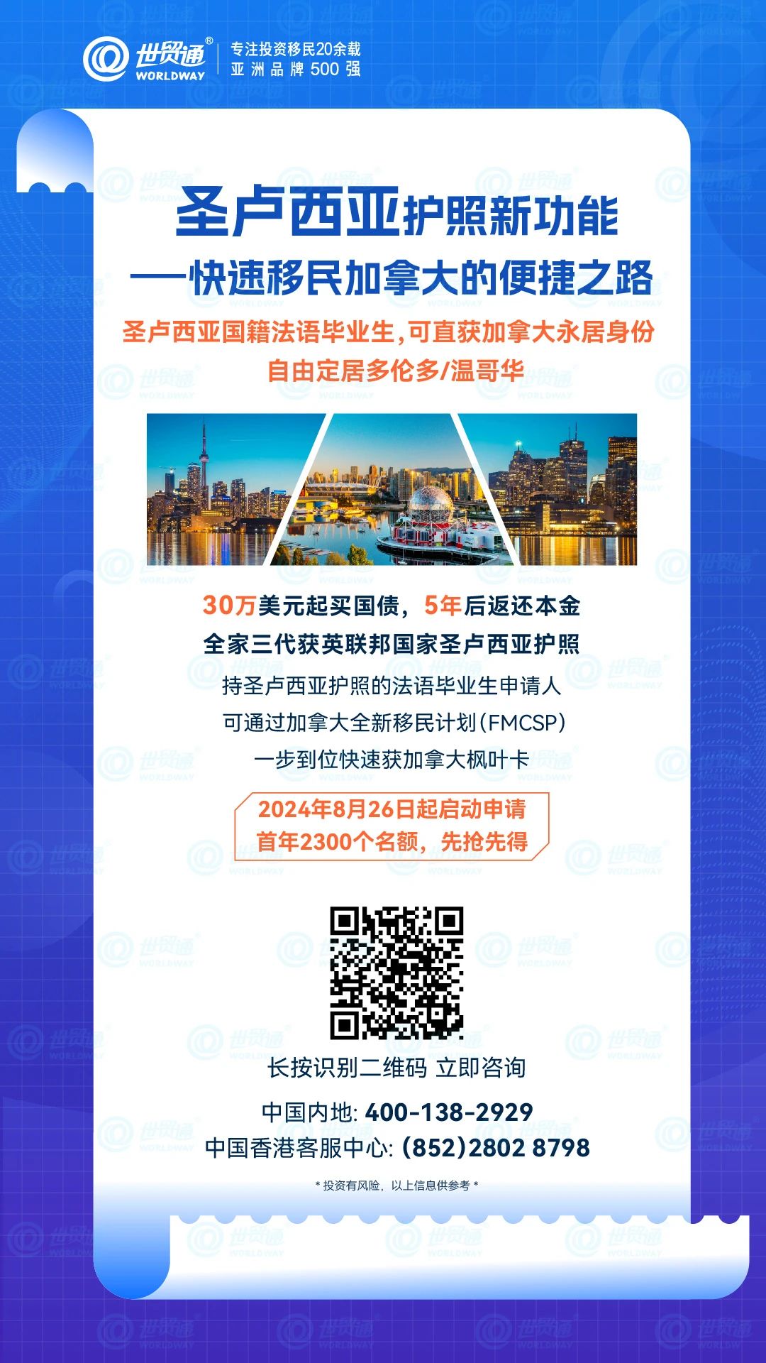 作为英联邦国家投资入籍项目的积极推动者,早在本世纪初就已开展英联邦国家快速入籍项目推广,是最早在中国推广英联邦国家投资入籍项目的移民公司之一。在英联邦护照项目推广方面,世贸通拥有丰富的经验和众多成功案例。世贸通集团是由圣卢西亚政府授权的专业移民机构,值得您选择。