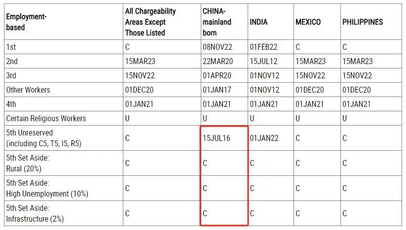 B表:Dates For Filing Of Employment-Based Visa Applications
