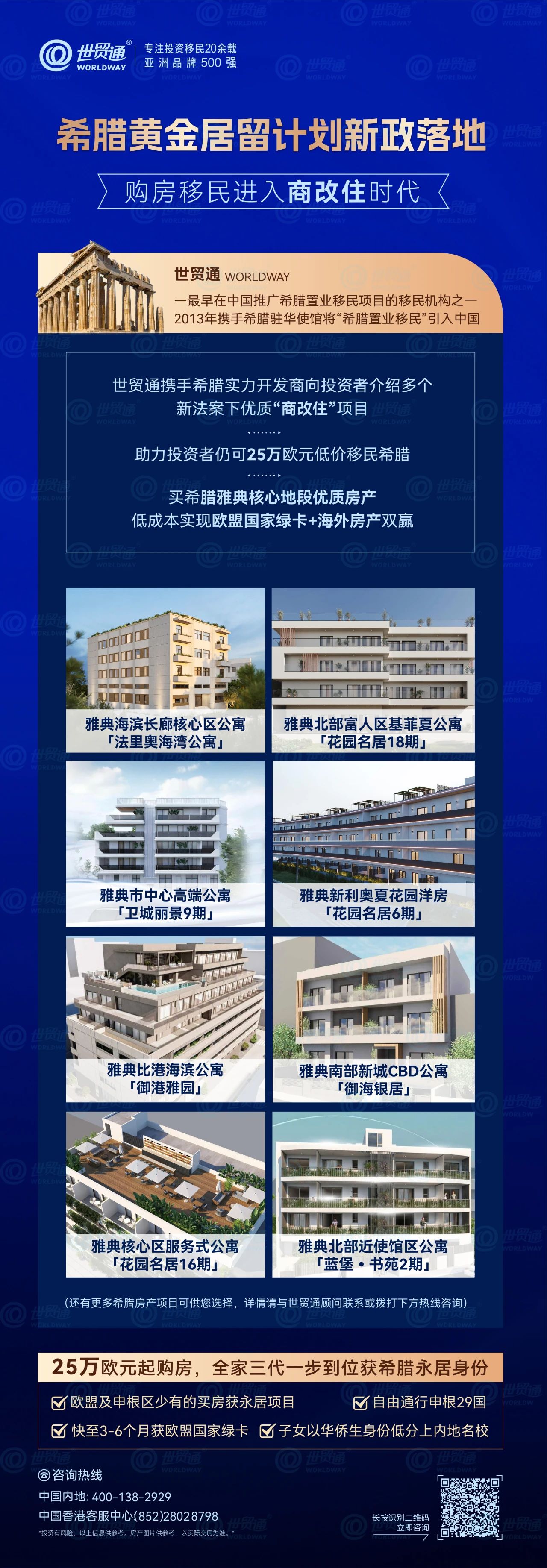 作为目前移民市场上少有的可以快速拿欧盟绿卡的项目,希腊凭借其低门槛、高福利、优教育的多重优势,持续吸引着中国投资者的目光。投资者投资25万欧元起的房产,即可一步到位获欧盟国家希腊永居身份!目前市场上符合希腊黄金居留项目申请法案、能快速过户的优质“商改住”房源不多,建议广大有意向的投资人把握机会,早选房早过户,早拿身份早安心!