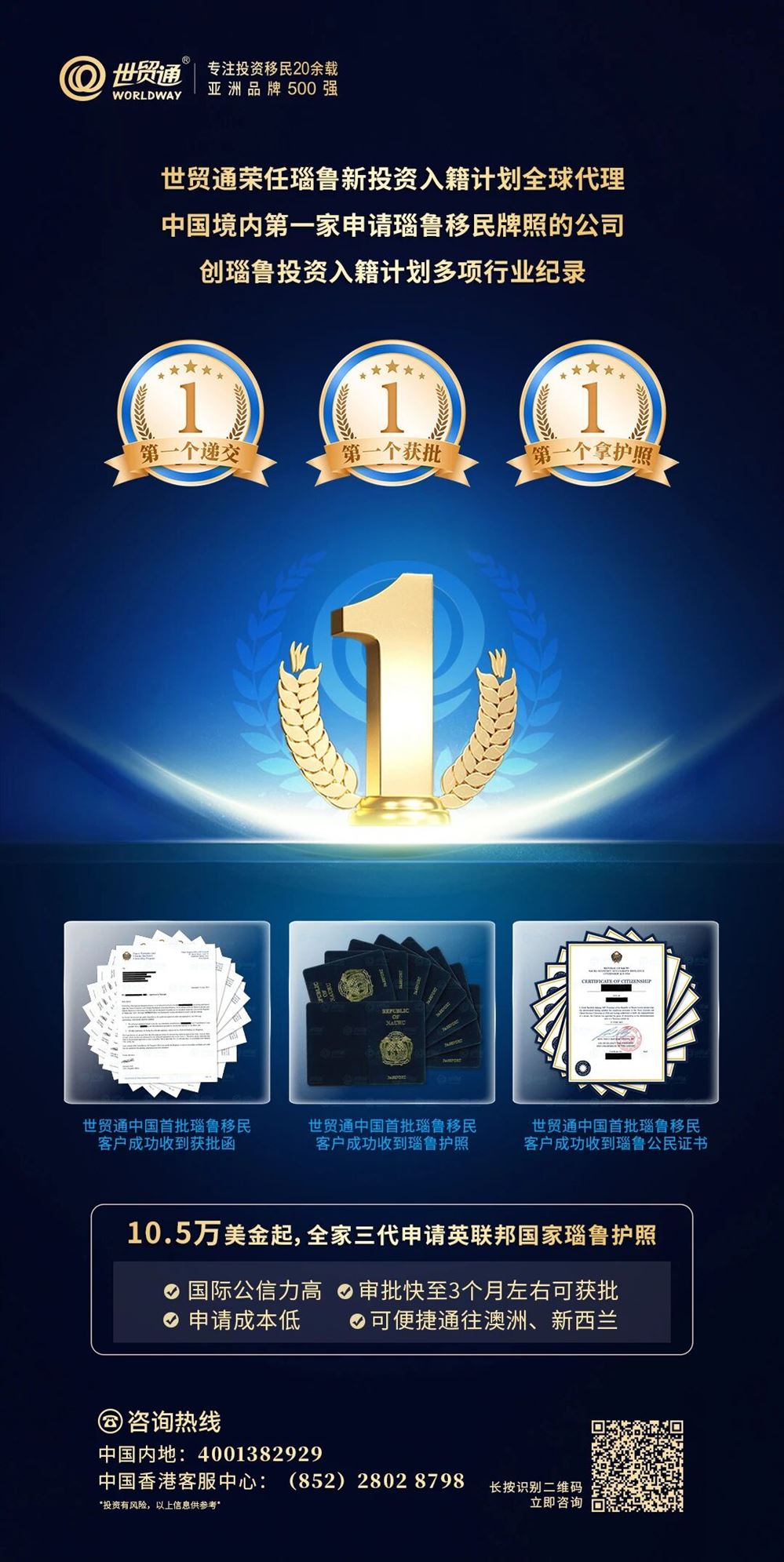 作为瑙鲁政府官方授权的全球代理机构,世贸通不仅是中国境内首家申请瑙鲁移民牌照的机构,第一组客户申请材料更率先进入国会审批流程,更是创造了“第一个递交、第一个获批、第一个拿护照”的行业纪录,充分展现了世贸通的专业实力和高效执行力。