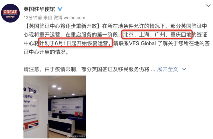 英国驻华使馆表示,中国北京、上海、广州、重庆四地的签证中心将于6月1日起开始恢复运营,重启服务的签证中心将会联系现有客户!同时,由于疫情限制,部分英国签证及移民服务仍将关闭,具体情况还需联系自己所在地的签证中心。在后续阶段,其他签证中心也将逐渐恢复运营。