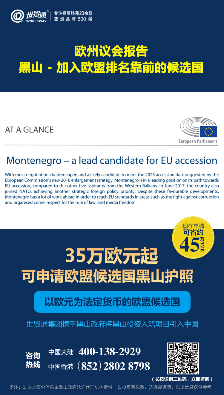 目前,在开放投资入籍项目的国家中,黑山是欧盟委员会公开表示“可能会在2025年之前加入欧盟”的国家,欧洲议会官网发布的一份报告称,黑山是加入欧盟排名靠前的候选国!欧盟官方表示,疫情不会阻碍欧盟的扩张进程,黑山的入欧盟谈判仍将继续,2020年将完成更多谈判章节!黑山投资入籍项目的推出,为投资者开辟了在未来获得欧盟公民身份的蹊径,此项目已成为投资者海外投资、营商、身份、健康规划的上佳之选!