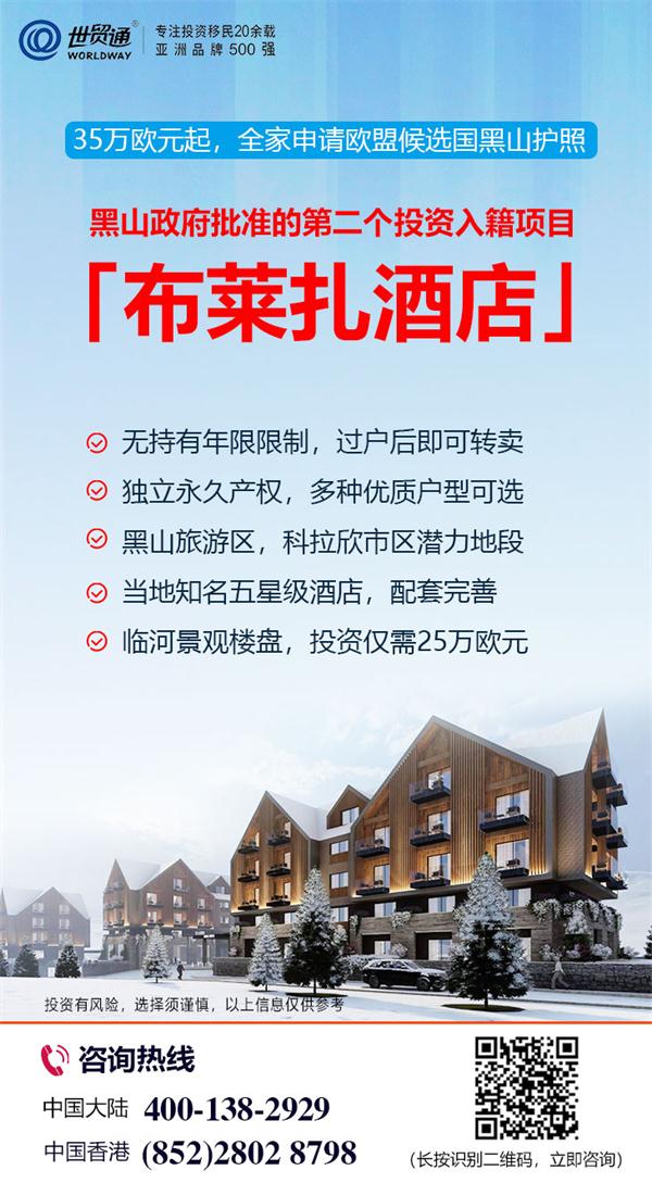 目前,黑山政府批准的投资入籍项目——「布莱扎酒店」和「布杰拉西卡1450酒店」项目,是欧洲投资移民市场上,投资期限较短的移民项目,该项目没有持有年限限制,投资者过户后可自由转卖!备受众多投资者热捧!35万欧元起,不仅能收获永久产权的房产,还能全家申请欧盟候选国黑山护照,实现海外房产和海外身份的双赢!