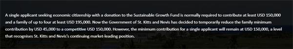 近日,圣基茨和尼维斯移民局发布通知:自2020年7月3日起至2020年12月31日期间,通过可持续增长基金方式移民圣基茨和尼维斯的投资人,一家四口以内家庭的捐献金额将从19.5万美元降至15万美元。