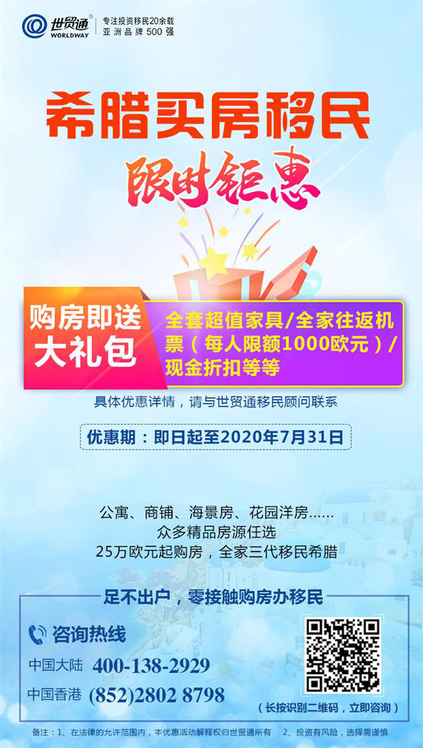 2020的上半年,希腊政府为广大投资者带来了多项投资移民优惠政策,如:简化申请流程、缩短等待时间、延长居留卡期限等等,为广大投资者增强了希腊移民办理的信心。若您有健康规划、教育、养老、资产配置等需求,一定要提前行动起来。现在正是投资希腊的较佳时期! 投资人在购房之后可出租、可售卖,还能享受身份带来的一系列福利,可谓是一举多得。7月正值希腊买房移民优惠期,机会难得,购房即可获大礼包。