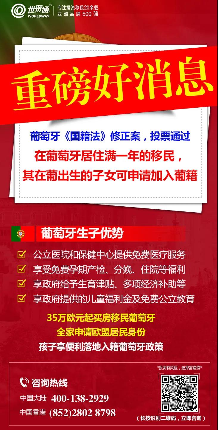 葡萄牙黄金签证申请者持续增加,而通过购房移民方式也正大受欢迎,有意向移民葡萄牙的投资者,目前可通过葡萄牙黄金居留计划,购买35万欧元起的房产,可全家三代申请葡萄牙黄金居留身份,享受葡萄牙优厚社会福利和优质教育资源,自由通行26个申根国,满足条件后可以申请葡萄牙公民身份,即入籍葡萄牙,获得欧盟护照,同时还能收获永久产权的房产,可谓一举多得! 有意向投资葡萄牙的人士,不妨把握政策利好,利用仍可在里斯本、波尔图购房移民的大好时机,早一点办理早一点拿到身份。