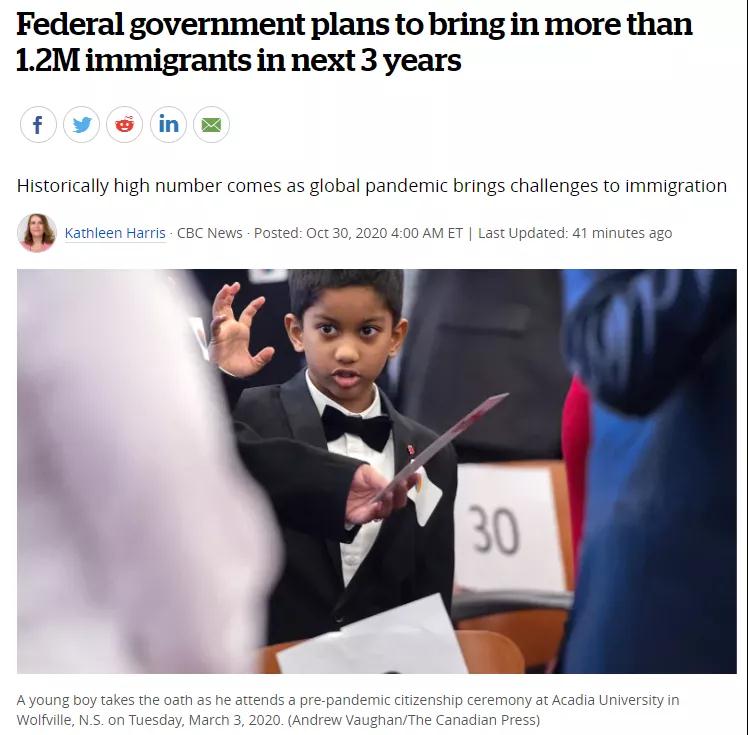 2020年10月30日,加拿大移民部部长Marco Mendicino宣布了《2021年至2023年移民水平计划》,未来三年接收的总移民数量将为123.3万!这个计划是加拿大有史以来吸纳移民数字最高的移民计划,或将开创加拿大移民历史新记录!